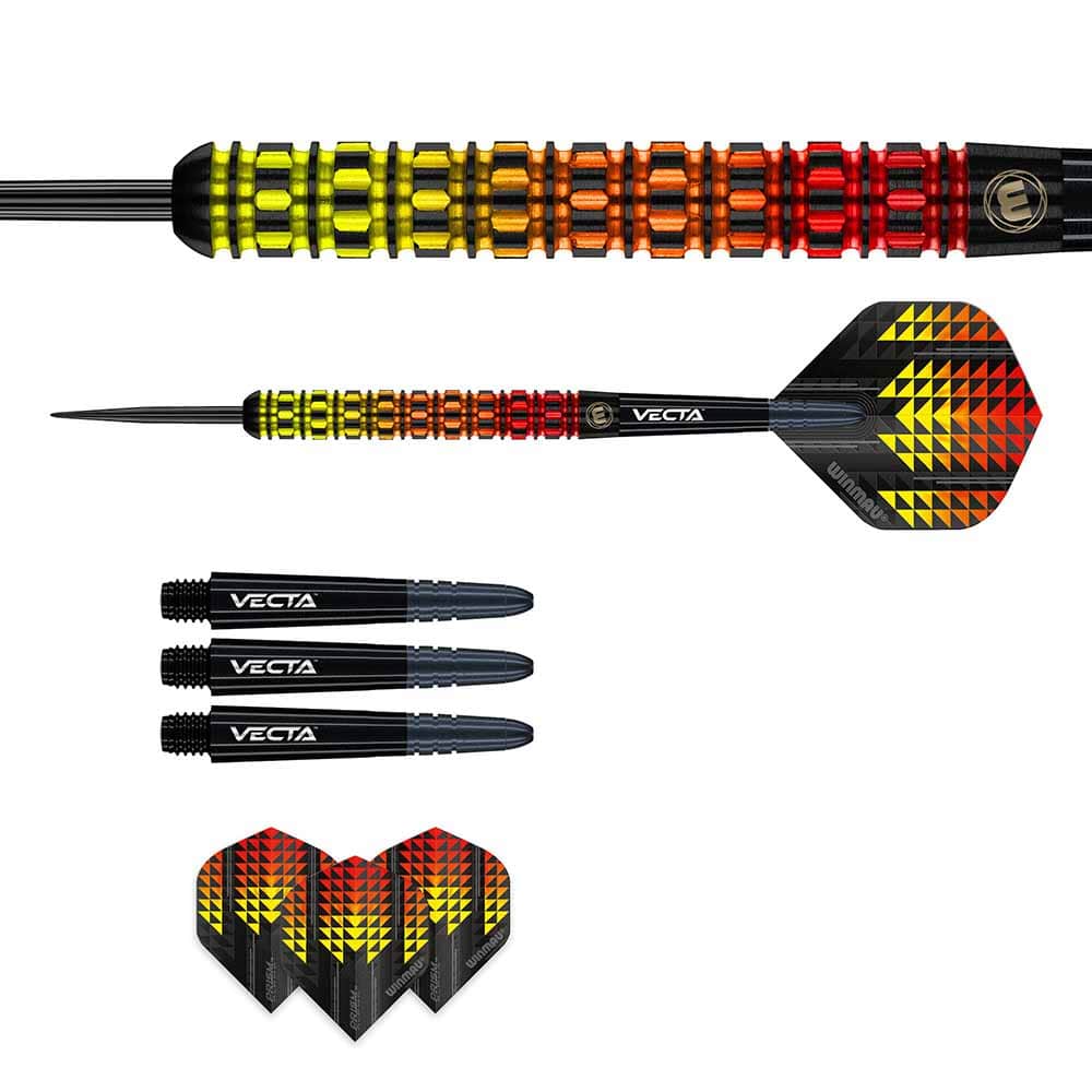 El juego de dardos Winmau Firestrom Flame, se compone por 1 set de 3 cuerpos , 1 set de 3 plumas y 1 set de 3 cañas