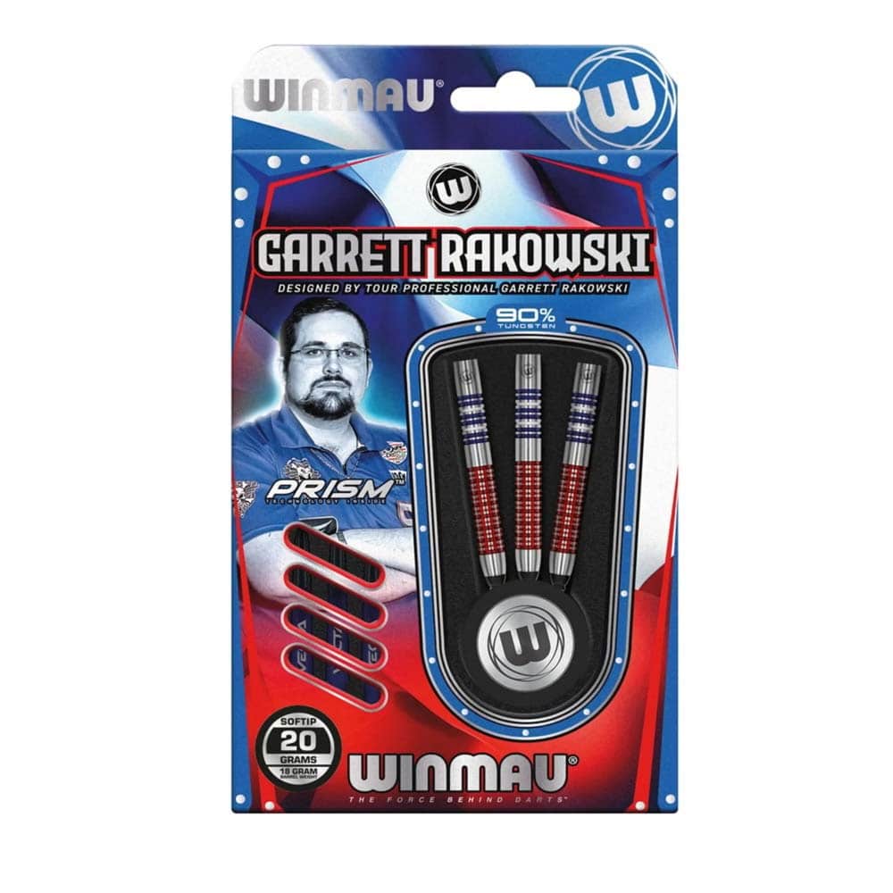 El producto se compone de por 1 set de 3 cuerpos Garrett Rakowski de la marca Winmau Darts, 1 set de 3 cañas Vecta corta, 1 set de plumas Prism Delta, 3 puntas Triton Winmau de plástico rosca 2ba y 1 protector de puntas.