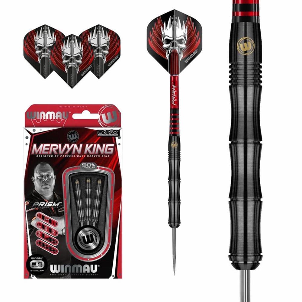 El juego de dardos Winmau Mervyn King 24gr se compone por 1 set de 3 cuerpos con punta de aluminio, 1 protector de puntas de aluminio, 1 set de 3 cañas Prism Force medium y 1 set de 3 plumas Prism Alpha standard extra thick.