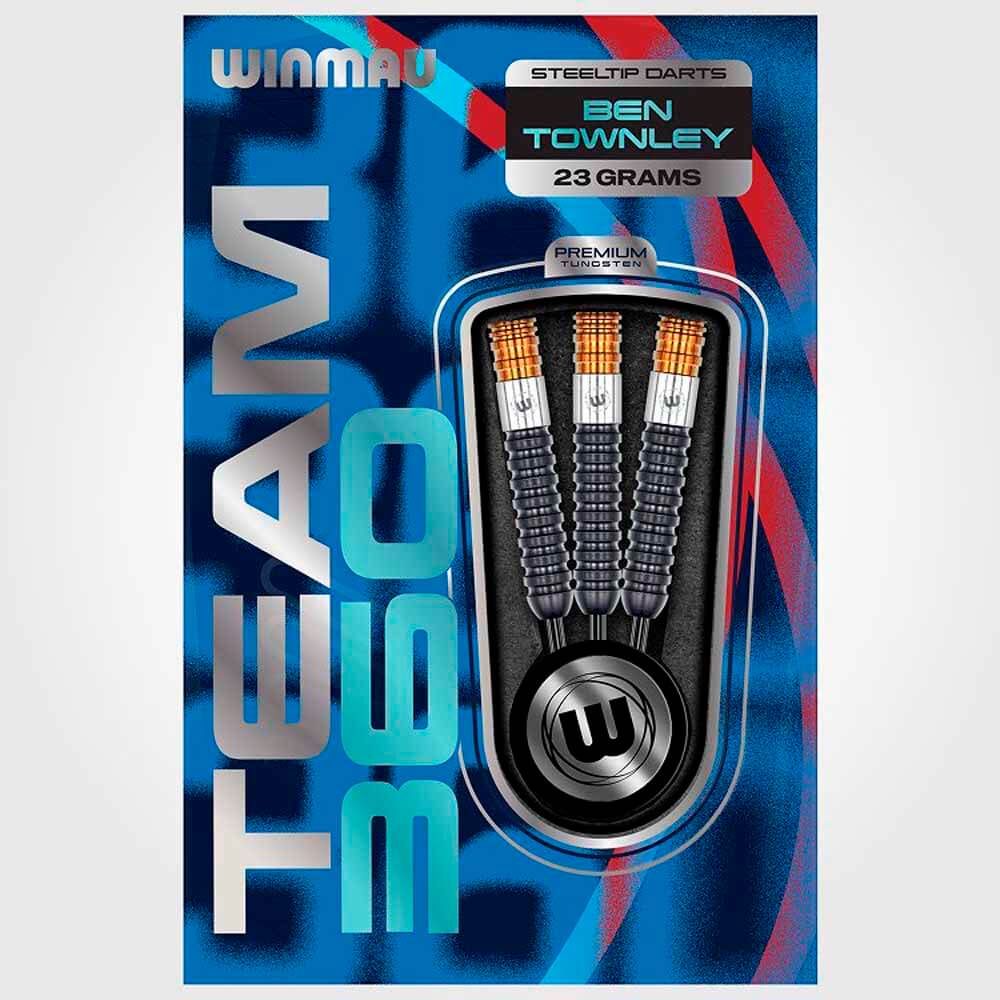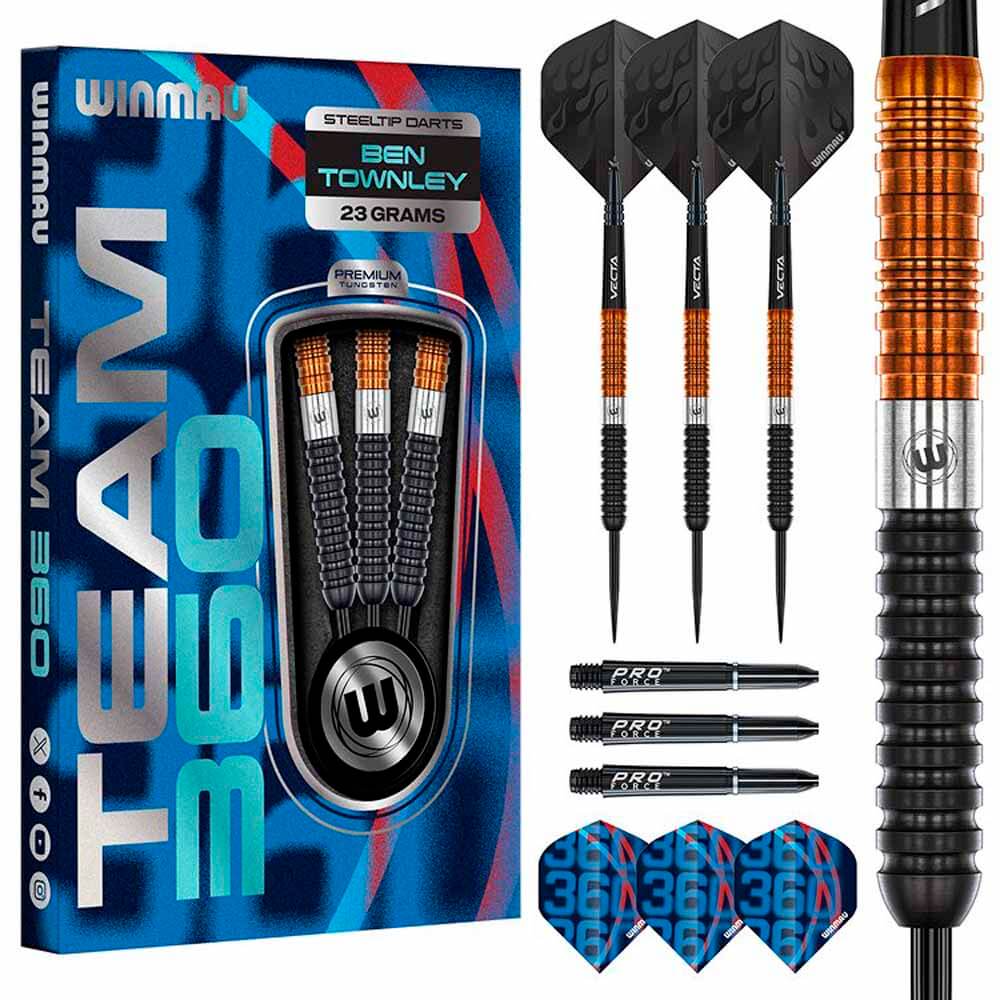 El juego de dardos Winmau Ben Townley 23gr se compone por 1 set de 3 cuerpos, 1 set de 3 cañas y 1 set de plumas