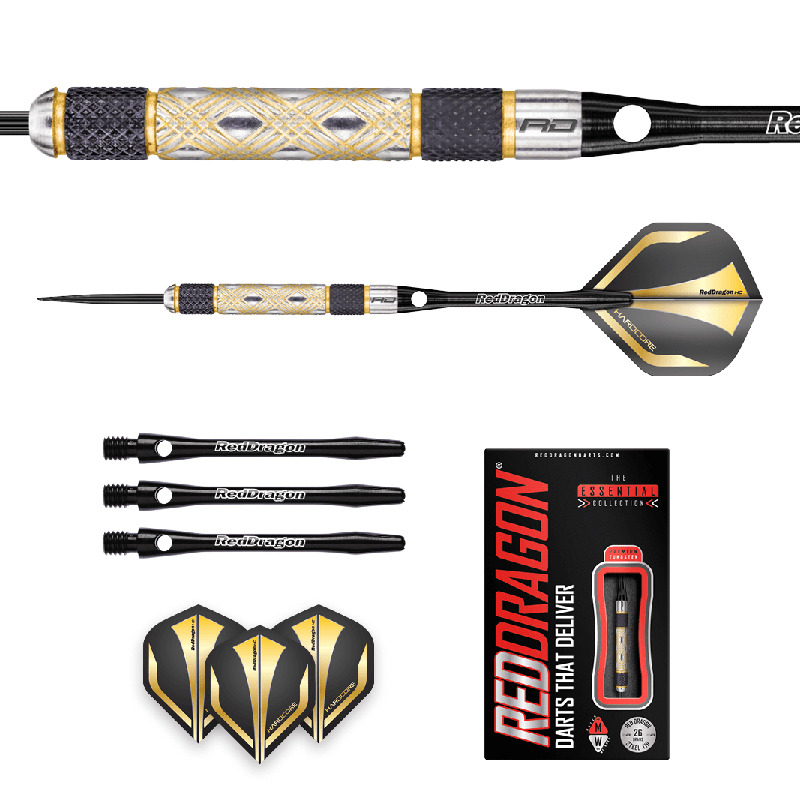 El juego de dardos se compone por 1 set de 3 cuerpos Golden Eye 1 Red Dragon, 1 set de 3 cañas y 1 set de 3 plumas Red Dragon.