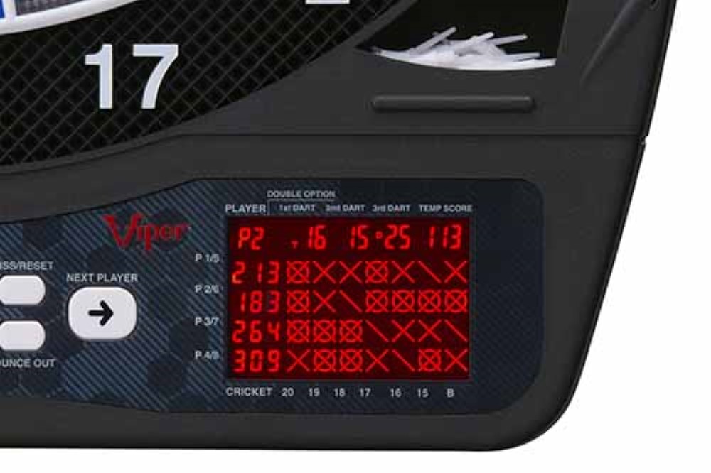 Incluye la función simple in/out, doble in/out y doble bull. El receptor de la diana Viper 800 es muy elegante gracias a sus segmentos rojos y negros que aseguran la correcta visión de donde puntúan los dardos.
