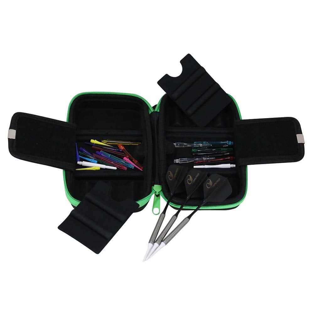 Capacidad de almacenamiento: 2 juegos de dardos completos, 2 tarjetas, plumas, cañas y puntas