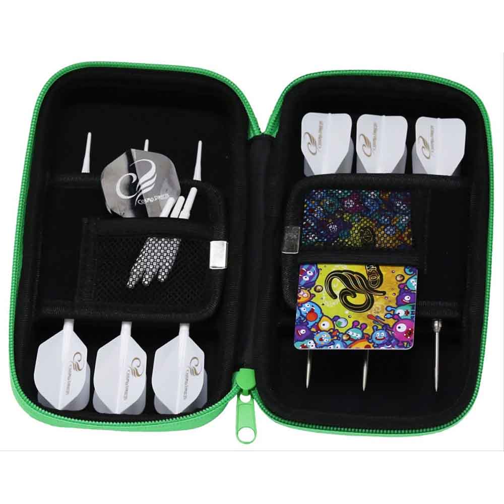 Capacidad de almacenamiento: 2 juegos de dardos completos, 2 tarjetas, plumas, cañas y puntas