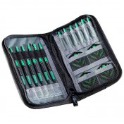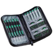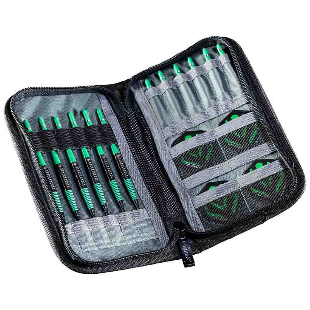 Funda de gran calidad y con una capacidad para dos juegos de dardos desmontados, 4 bolsillos con juegos de plumas, bolsillo multi usos y varios compartimentos para cañas o puntas para dardos.