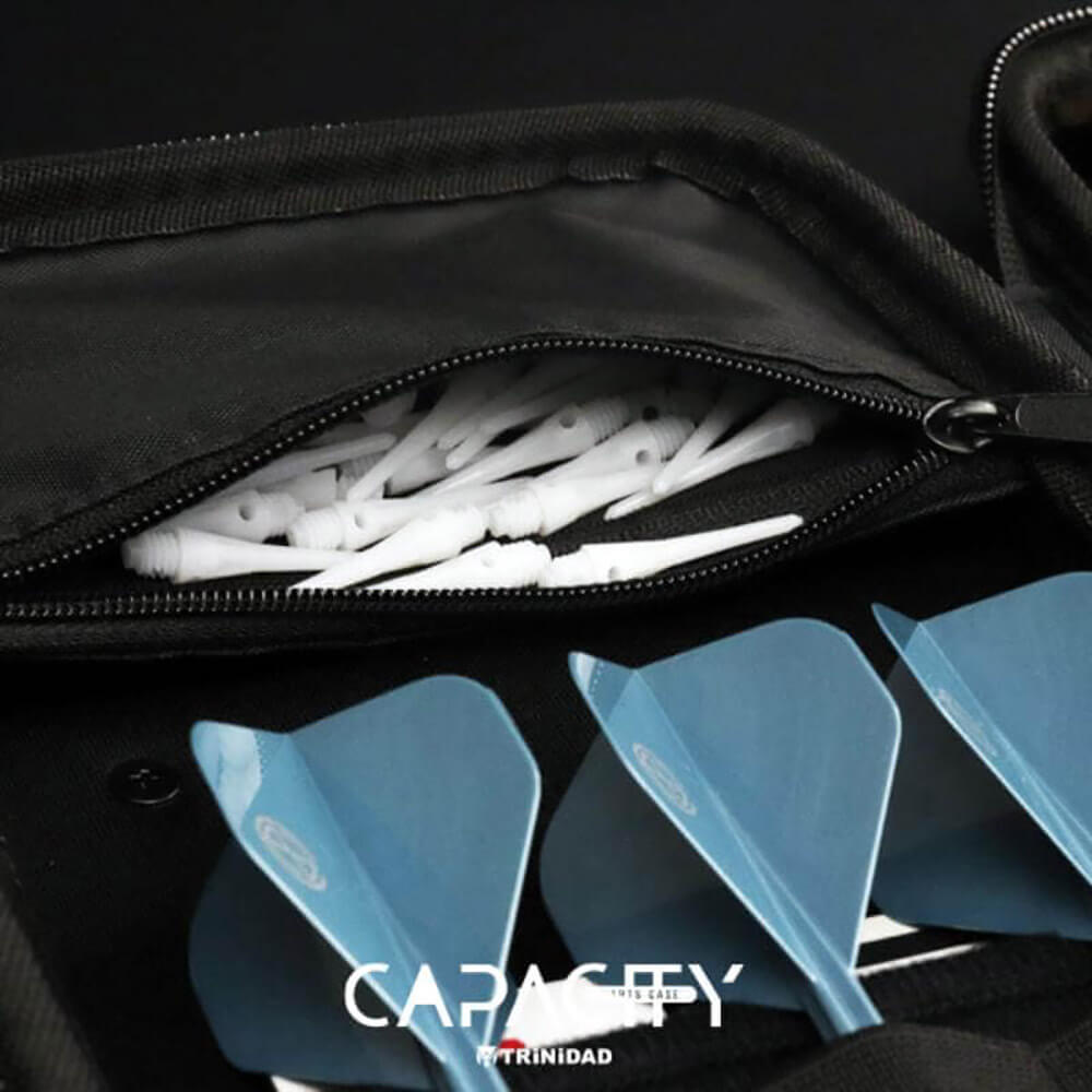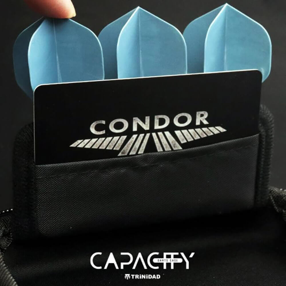 Capacidad para 2 juegos de dardos montados, 1 set de 3 plumas Condor, 1 bolsillo para tarjetas y 1 bolsillo con cremallera.