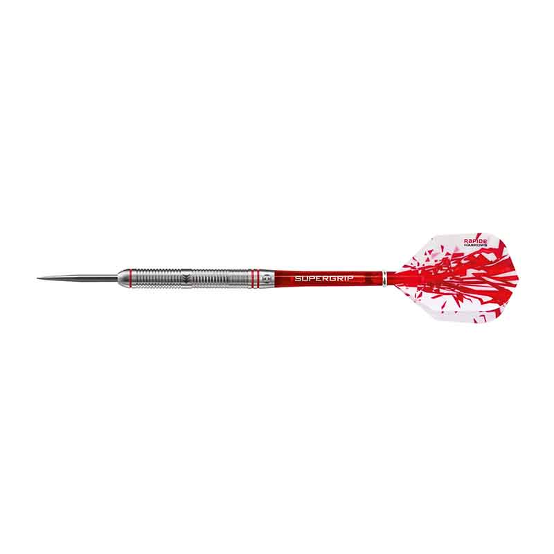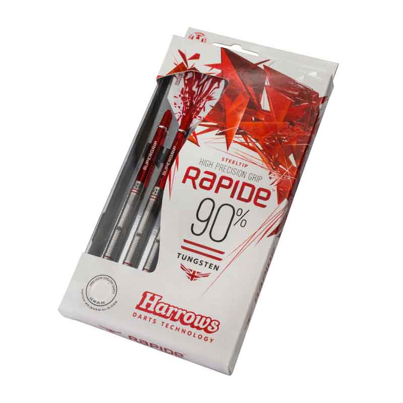 El dardos se compone por 1 set 3 cuerpos de dardos Rapide, 1 set 3 cañas de cañas Supergrip, 1 set 3 plumas Harrows Rapide.