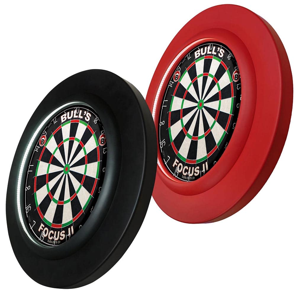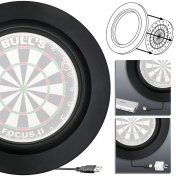 El moderno LED PU Surround ilumina su diana de manera óptima con sus 180 LED. Las lámparas son de color blanco frío y están colocadas de tal manera que el proyector no se deslumbra. El PU Surround profesional tiene aproximadamente 3,5 cm de grosor. Debido a esta fuerza, el jugador puede decidir por sí mismo hasta qué punto se presiona el borde en el tablero de dardos. Cuanto más profundo es el marco en el tablero de dardos, más oscura se vuelve la superficie de juego de la diana. Cada jugador de dardos puede así determinar individualmente la iluminación óptima de su diana. Se adjunta un cable USB al envolvente, este se puede conectar a una unidad de fuente de alimentación de 2,4 A o un banco de energía, ninguno de los cuales está incluido en el volumen de suministro. El material de PU protege la pared de daños y minimiza el número de dardos que caen, lo que también protege los dardos y el suelo. El nuevo y mejorado ajuste con un diámetro interior de aproximadamente 45 cm encaja perfectamente en todas las diana de pelo conocidas.