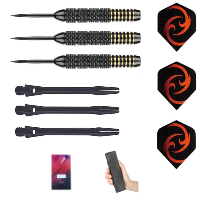 El juego se compone de 3 dardos completos, 1 set de 3 cuerpos, 1 set de 3 cañas y 1 set de 3 plumas