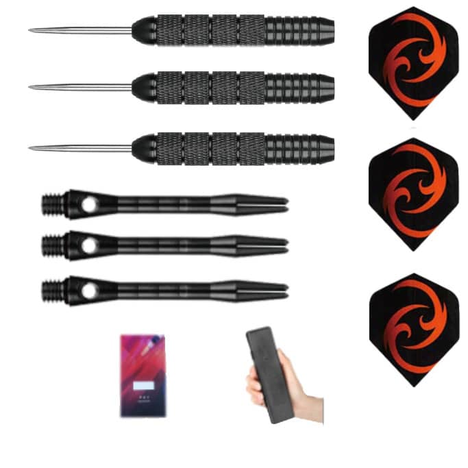 El juego se compone de 3 dardos completos, 1 set de 3 cuerpos, 1 set de 3 cañas y 1 set de 3 plumas