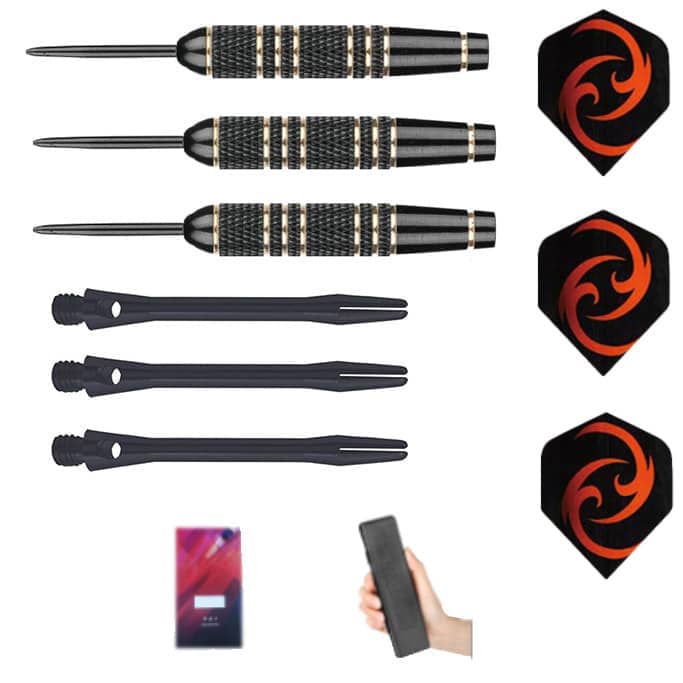 El juego se compone de 3 dardos completos, 1 set de 3 cuerpos, 1 set de 3 cañas y 1 set de 3 plumas