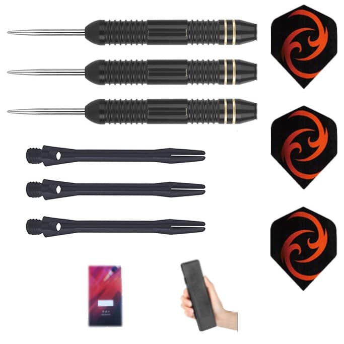 El juego se compone de un juego de dardos completo compuesto por 3 cuerpos de dardos, 3 cañas y 3 plumas