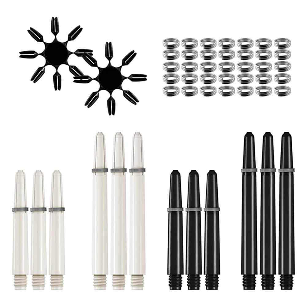 El producto se compone por 2 juegos de dardos recubiertos de latón de acero 24 g de peso , 6 juegos de 3 plumas, 6 juegos de 3 cañas de nailon, 16 protectores de plumas y 32 anillos de caña para sujetar la pluma.