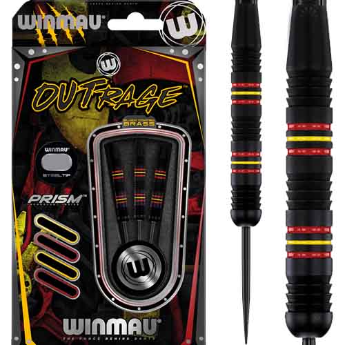 El dardos se compone por 1 set de 3 cuerpos Outrage , 1 set de 3 plumas winmau Prism, 1 set de 3 cañas Winmau Prism Force 1 soporte circular Winmau para poder llevar los dardos pinchado en el.