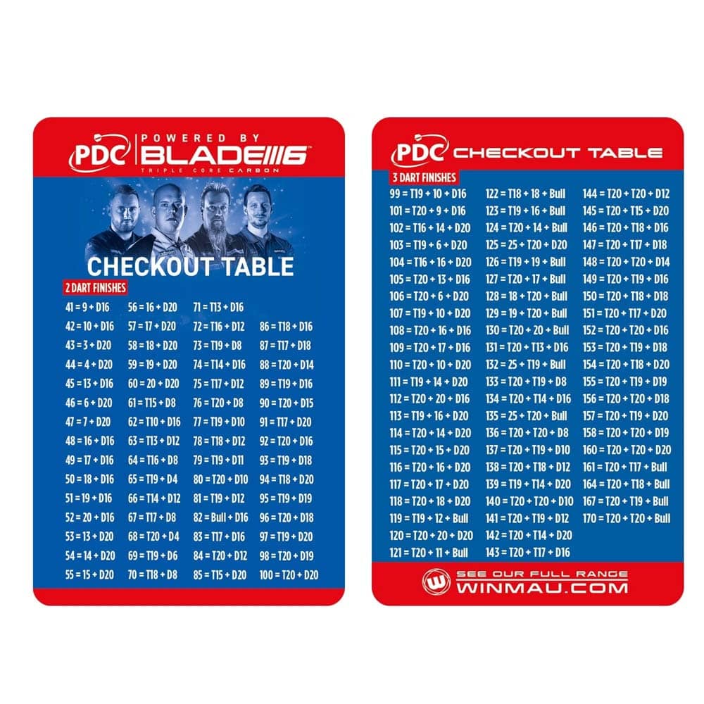El producto se compone por 1 tarjeta Winmau PDC Checkout Tables con las tablas de cierres impresas por las dos caras.