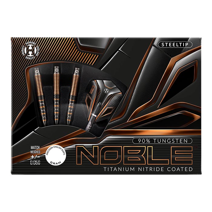 Dardos con un trabajo en su cuerpo perfecto, con varios tipos de agarre y un acabado muy ergonómico, anillos lacados en dorado y plateado , el acabado final del modelo Noble a sido con nitrito de titanio negro para realzar aún su excelente trabajo de Harrows en este modelo.