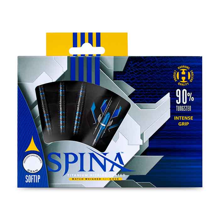 Dardos de gran calidad fabricados por Harrows Darts, modelo Spina Black, dardos con un barril total diferente a los que has probado, gracias a su agarre de anillas con varios tipos de separación, parte del barril incorpora el sistema de agarre tipo shark invertido, el acabado del dardos es color dorado y con anillos en azul, dardo acabado con nitrito de titanio negro.